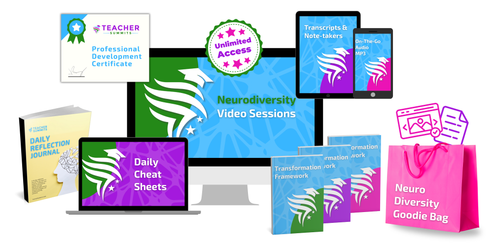• Over 100 pages TO TEACH YOUR NEURODIVERSE STUDENTS to implement each presentation.• ALL 18 SESSIONS INCLUDED.• BONUS: List of all the resources mentioned.• NO NEED TO TAKE NOTES as you watch, or rewind if you missed something.